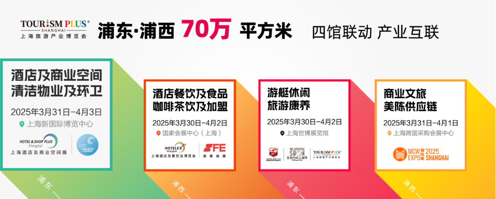 本届美陈展首次携手博华旗下四大展览——上海旅游产业博览会主题馆、上海国际游艇展暨生活方式上海秀、上海国际酒店及餐饮业博览会、上海国际酒店及商业空间办公及公共空间博览会,分别于上海跨国采购中心、上海世博展览馆、国家会展中心(上海)、上海新国际博览中心举办。3月30日-4月3日,2025上海旅游产业博览会将五展盛放、四馆同开,共同形成涵盖美陈业、旅游业、酒店业、餐饮业、食品业、零售业、商业地产业、建筑装饰业、景观工程业、物业管理业、清洁运维业、连锁加盟业、船艇制造业、运动及户外业、大健康业等15个产业大类的巨型展览集群,实现展览联动、产业联动以及资源整合。